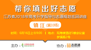 江蘇省2018年高考升學(xué)指導(dǎo)與志愿規(guī)劃巡回講座(鎮(zhèn)江) [線下] 活動時(shí)間:2018-06-16 09:00 - 10:00 活動地點(diǎn):觀海樓酒店5樓會議室,夢溪路2號 活動人數(shù):500 -