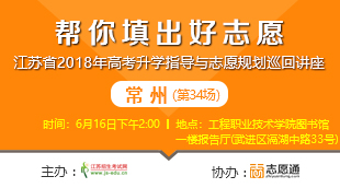 江蘇省2018年高考升學(xué)指導(dǎo)與志愿規(guī)劃巡回講座(常州) [線下] 活動時(shí)間:2018-06-16 14:00 - 15:00 活動地點(diǎn):常州工程職業(yè)技術(shù)學(xué)院圖書館一樓報(bào)告廳,常州市武進(jìn)區(qū)滆湖中路33號 活動人數(shù):500 -