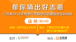 江蘇省2018年高考升學(xué)指導(dǎo)與志愿規(guī)劃巡回講座(揚(yáng)州) [線下] 活動時(shí)間:2018-06-18 09:00 - 10:00 活動地點(diǎn):揚(yáng)州市廣陵區(qū)汶河北路42號藍(lán)天大廈4樓會議廳 活動人數(shù):500 -