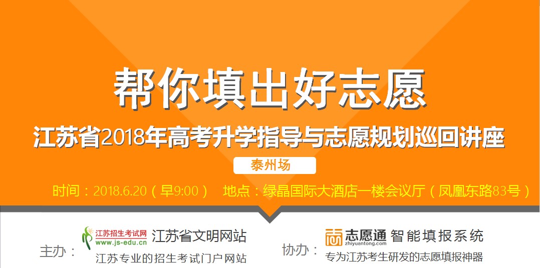 江蘇省2018年高考升學(xué)指導(dǎo)與志愿規(guī)劃巡回講座(泰州) [線下] 活動時(shí)間:2018-06-20 09:00 - 11:00 活動地點(diǎn):綠晶國際大酒店一樓會議廳,鳳凰東路83號 活動人數(shù):500 -