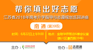 江蘇省2018年高考升學(xué)指導(dǎo)與志愿規(guī)劃巡回講座(南通) [線下] 活動時(shí)間:2018-06-22 09:00 - 10:30 活動地點(diǎn):南通金陵華僑飯店6樓會議室,崇川區(qū)濠西路39號 活動人數(shù):500 -