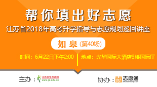 江蘇省2018年高考升學(xué)指導(dǎo)與志愿規(guī)劃巡回講座(如皋) [線下] 活動時(shí)間:2018-06-22 14:00 - 15:00 活動地點(diǎn):光華國際大酒店3樓國際廳 活動人數(shù):500 -