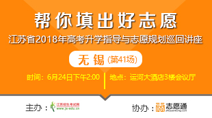 江蘇省2018年高考升學(xué)指導(dǎo)與志愿規(guī)劃巡回講座(無錫) [線下] 活動時(shí)間:2018-06-24 14:00 - 15:00 活動地點(diǎn):運(yùn)河大酒店3樓會議廳 活動人數(shù):500 -