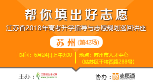 江蘇省2018年高考升學(xué)指導(dǎo)與志愿規(guī)劃巡回講座(蘇州) [線下] 活動時(shí)間:2018-06-24 09:00 - 10:00 活動地點(diǎn):蘇州市人才中心(中國江蘇省蘇州市姑蘇區(qū)干將西路288號) 活動人數(shù):500 -