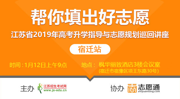江蘇省2019年高考升學(xué)指導(dǎo)與志愿規(guī)劃巡回講座(宿遷) [線下] 活動時(shí)間:2019-01-12 09:00 - 11:00 活動地點(diǎn):楓華麗致酒店3樓會議室(宿遷市宿豫區(qū)項(xiàng)王東路30號) 活動人數(shù):500 -