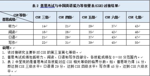 對接結(jié)果呈現(xiàn)了雅思、普思考試各技能和總成績對應(yīng)中國英語能力等級量表相關(guān)等級的臨界分?jǐn)?shù)。如:雅思聽力得5分,即達(dá)到中國英語能力等級量表四級水平;閱讀得5.5分,達(dá)到五級水平;口語得6分,達(dá)到六級水平;總成績得8分,即達(dá)到八級水平等。