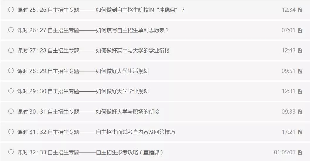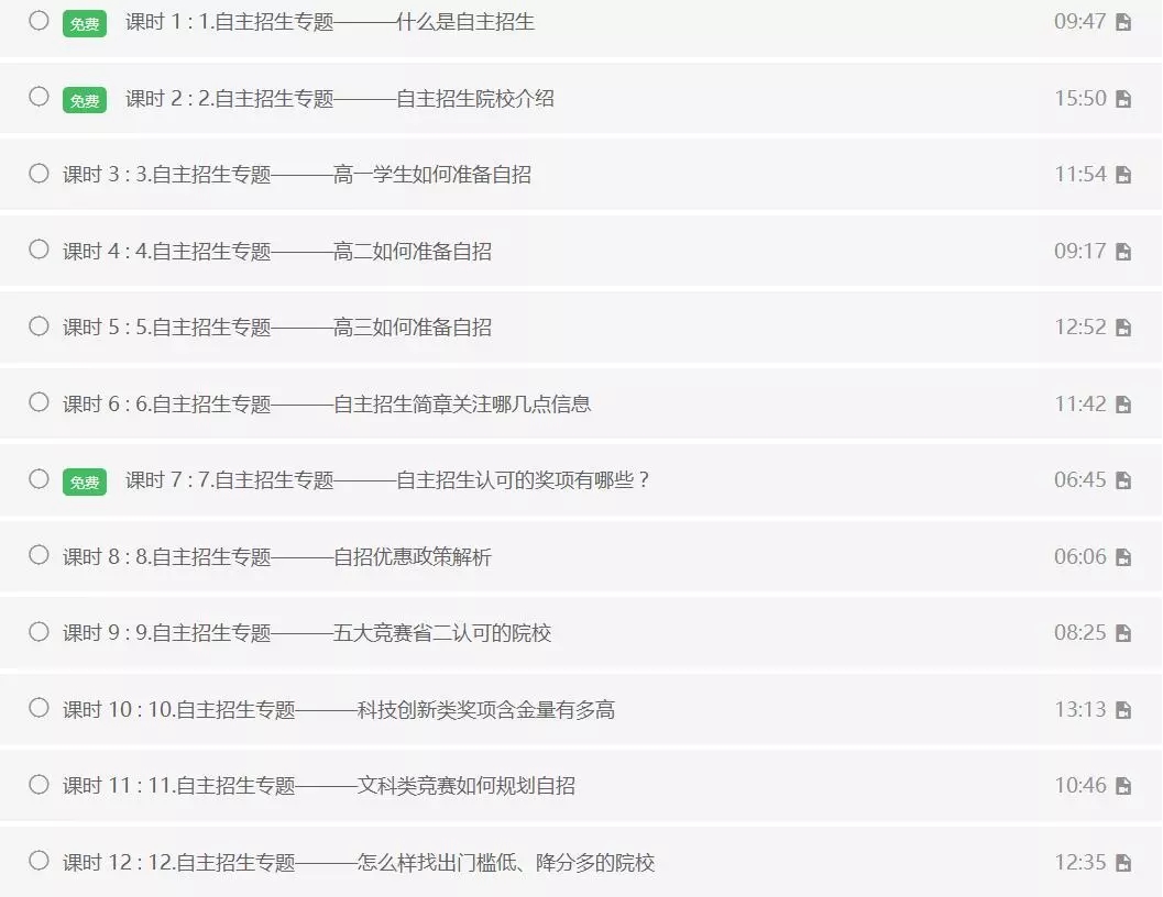 自主招生專題課程共有33課時(shí),其中課時(shí)1、課時(shí)2、課時(shí)7是免費(fèi)看哦,家長可以通過這些課程對(duì)什么是自主招生、自主招生認(rèn)可分獎(jiǎng)項(xiàng)等有個(gè)基礎(chǔ)的了解。