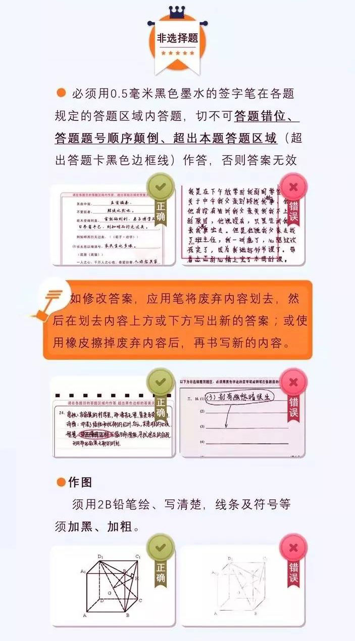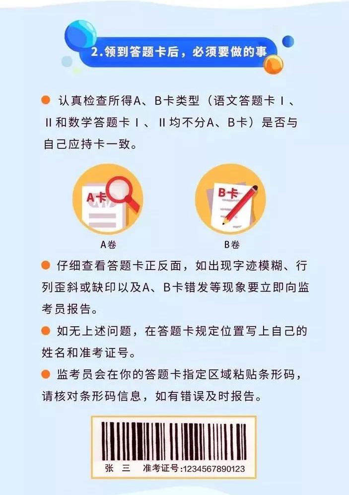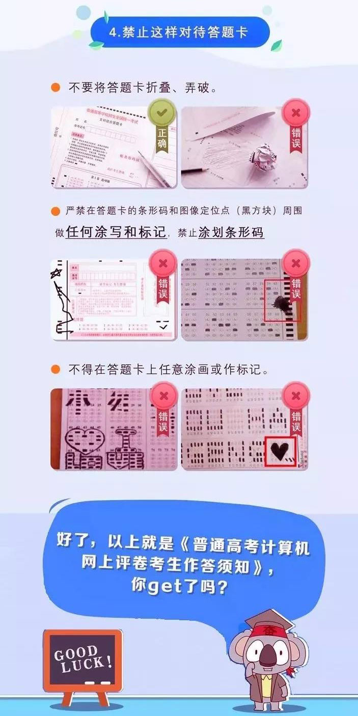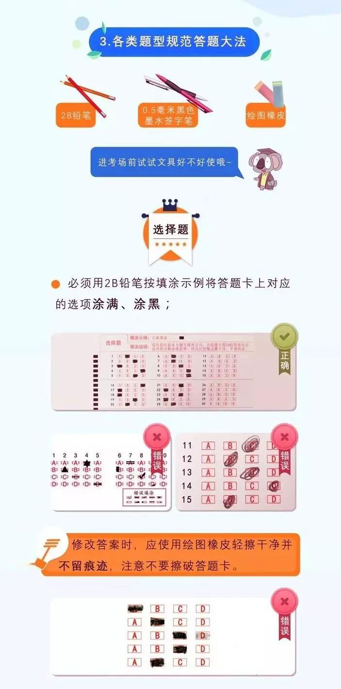 其次,現(xiàn)在所有試卷都是網(wǎng)上閱卷,所以在填答題卡的時候一定要看清楚。并且,有些學科選擇題比較多,比如英語,考生盡量提前15分鐘涂好答題卡,不要等到最后幾分鐘再慌忙地涂卡,這樣也容易出現(xiàn)看錯、漏涂的情況。