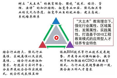 土木類專業(yè)特色:“大土木”教育理念下,強(qiáng)化行業(yè)屬性、區(qū)域?qū)傩?、發(fā)展屬性、實踐屬性,打造基于CDIO(Conceive-構(gòu)思、Design-設(shè)計、Implement-實現(xiàn)、Operate-運作)工程教育模式的應(yīng)用型人才培養(yǎng)專業(yè)特色: