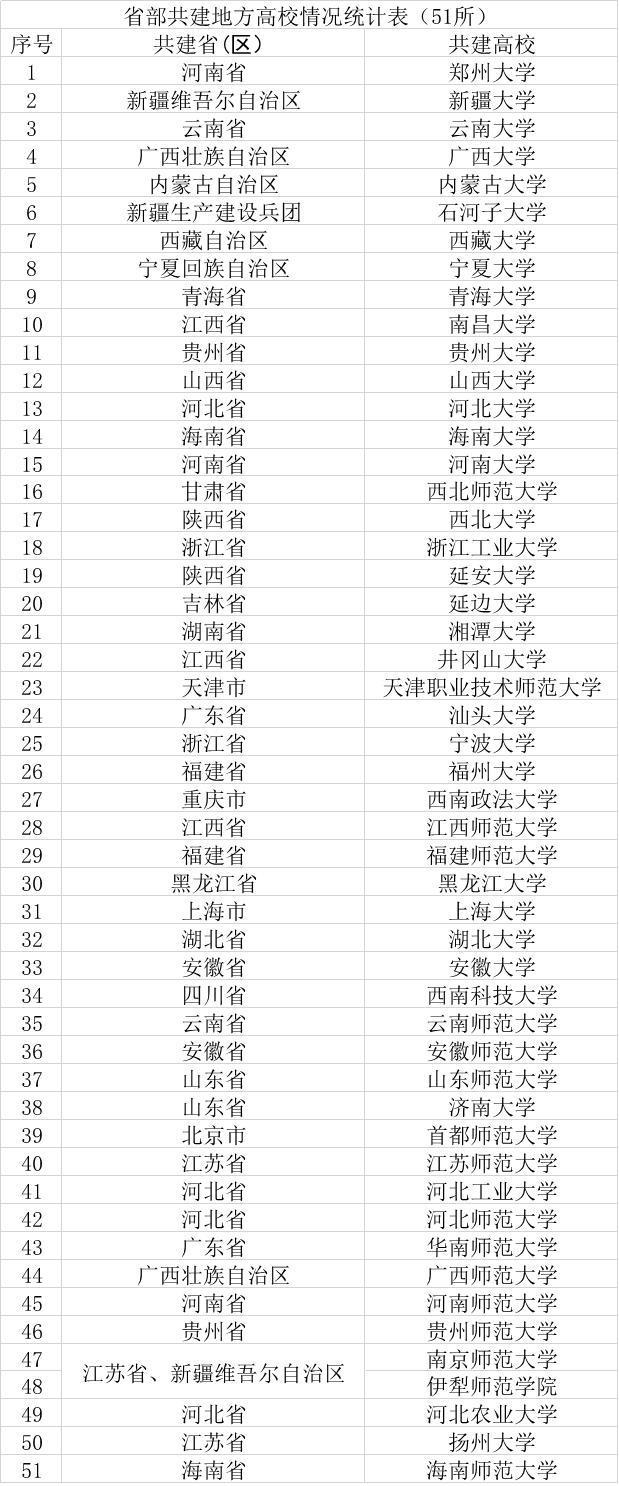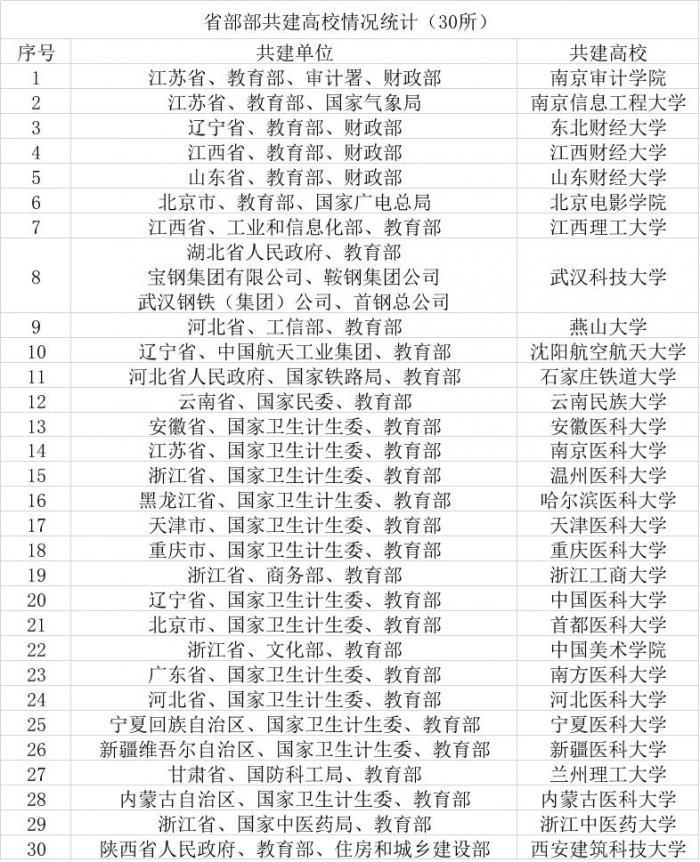 根據(jù)教育部網(wǎng)站發(fā)布的名單,目前省部共建高校共51所,其中包括4所“省部重點(diǎn)支持”高校;省部部共建高校共30所。