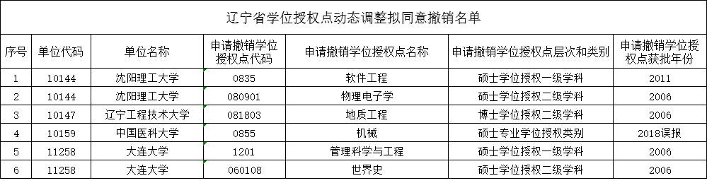 根據(jù)《國務(wù)院學(xué)位委員會關(guān)于做好博士碩士學(xué)位授權(quán)學(xué)科和專業(yè)學(xué)位授權(quán)類別動態(tài)調(diào)整工作的通知》(學(xué)位〔2017〕15號)精神,經(jīng)院校自行審核申報(bào)、遼寧省學(xué)位辦復(fù)核,2019年度擬同意撤銷沈陽理工大學(xué)軟件工程等6個(gè)學(xué)位授權(quán)點(diǎn),擬同意增列沈陽工業(yè)大學(xué)資源與環(huán)境等4個(gè)學(xué)位授權(quán)點(diǎn)。
