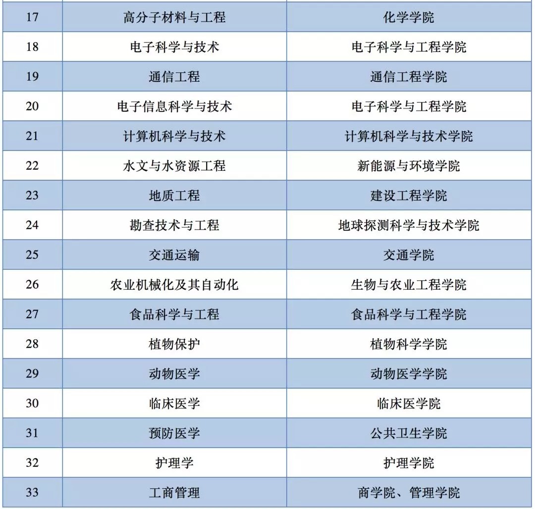 華南農(nóng)業(yè)大學(xué)(15):數(shù)學(xué)與應(yīng)用數(shù)學(xué)、應(yīng)用化學(xué)、生物技術(shù)、生態(tài)學(xué)、機(jī)械設(shè)計(jì)制造及其自動(dòng)化、農(nóng)業(yè)機(jī)械化及其自動(dòng)化、食品質(zhì)量與安全、農(nóng)學(xué)、園藝、植物保護(hù)、動(dòng)物科學(xué)、動(dòng)物醫(yī)學(xué)、林學(xué)、農(nóng)林經(jīng)濟(jì)管理、行政管理、