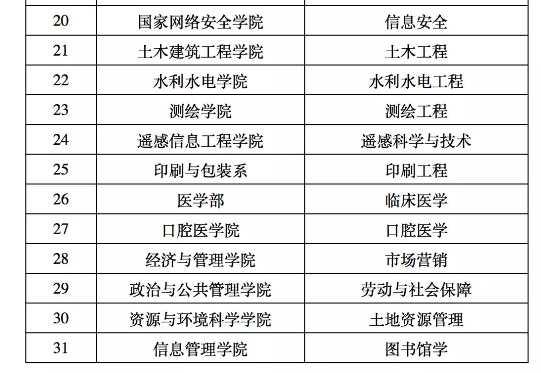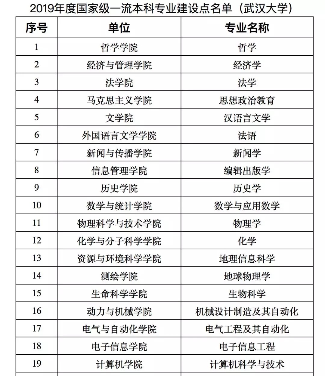 武漢大學(xué):31個(gè)國(guó)家級(jí)一流本科專業(yè)建設(shè)點(diǎn)及10個(gè)省級(jí)一流本科專業(yè)建設(shè)點(diǎn)均已獲批。