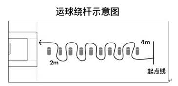 成績評定:運(yùn)球者運(yùn)球依次繞過所有標(biāo)志桿后射門,球沒有進(jìn)入球門無成績(包括球打在球門立柱和橫梁上),漏過標(biāo)志桿無成績。每人2次機(jī)會,取最好一次成績?yōu)樽詈蟪煽儭?/p>