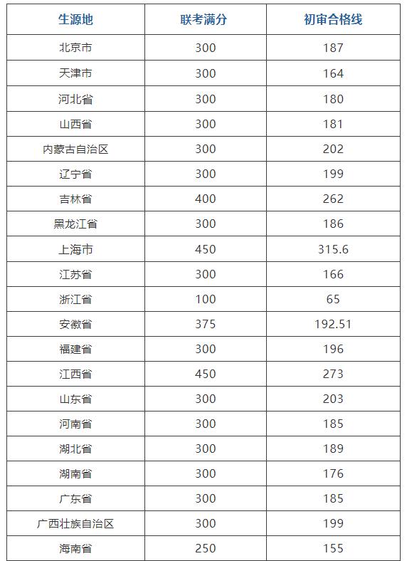 2.造型藝術(shù)、中國畫、藝術(shù)設(shè)計(jì)、城市藝術(shù)設(shè)計(jì)專業(yè)初審以各省美術(shù)與設(shè)計(jì)類聯(lián)考成績(jī)劃線,各省初審合格線如下: