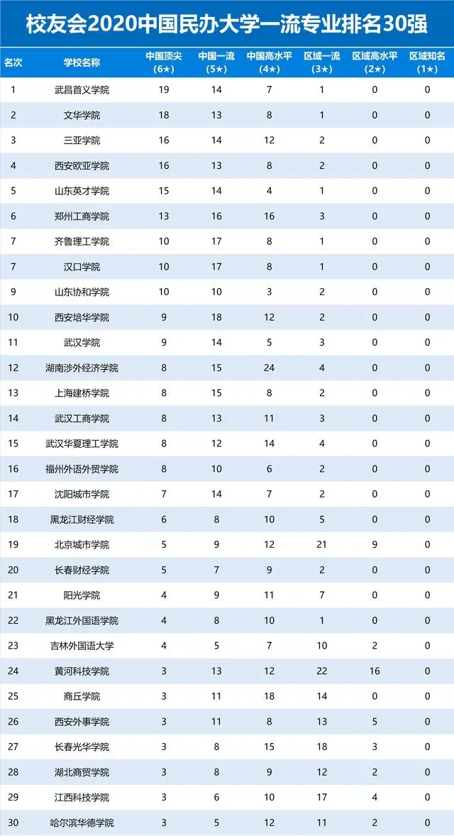 武昌首義學(xué)院、三亞學(xué)院、鄭州工商學(xué)院、文華學(xué)院、西安歐亞學(xué)院雄居校友會2020中國民辦大學(xué)最好專業(yè)排名前5強。