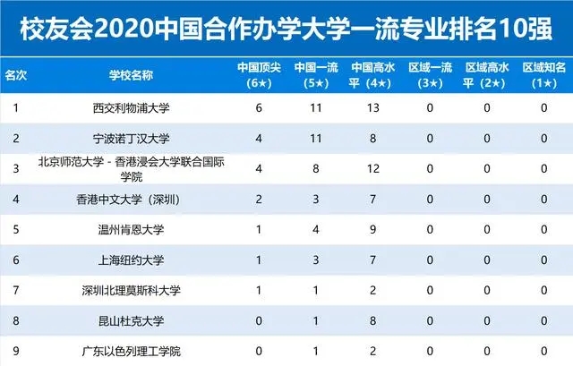 西交利物浦大學(xué)、北京師范大學(xué)-香港浸會大學(xué)聯(lián)合國際學(xué)院、寧波諾丁漢大學(xué)、香港中文大學(xué)(深圳)、溫州肯恩大學(xué)雄居校友會2020中國合作辦學(xué)大學(xué)最好專業(yè)排名前5強。