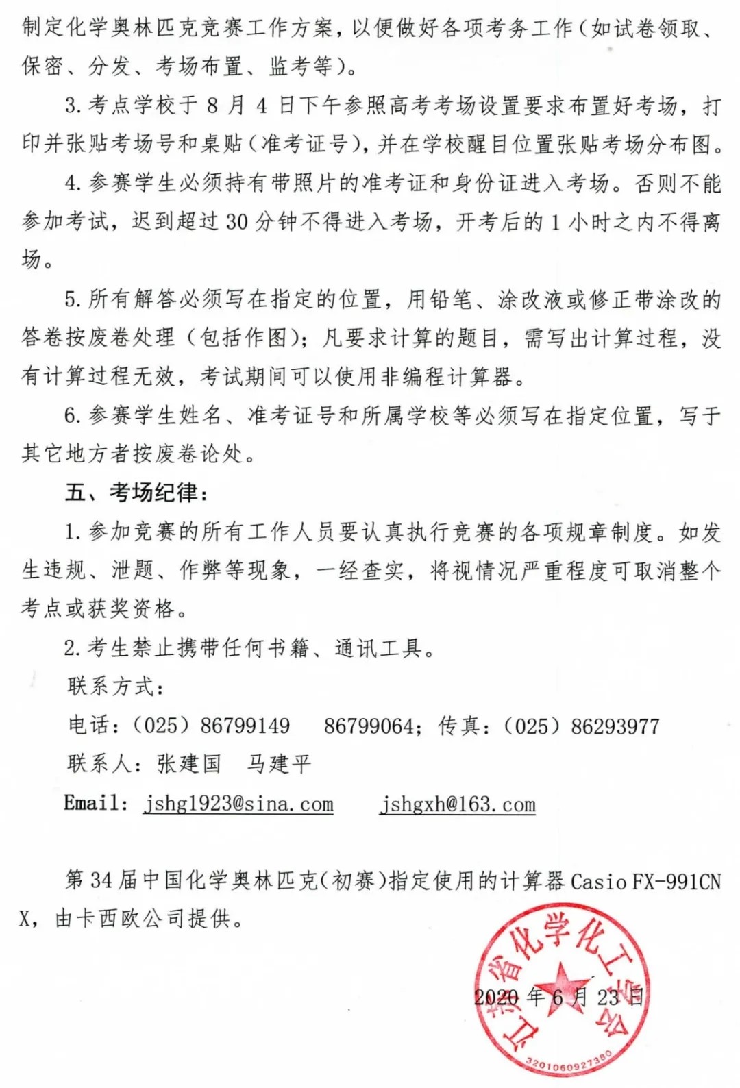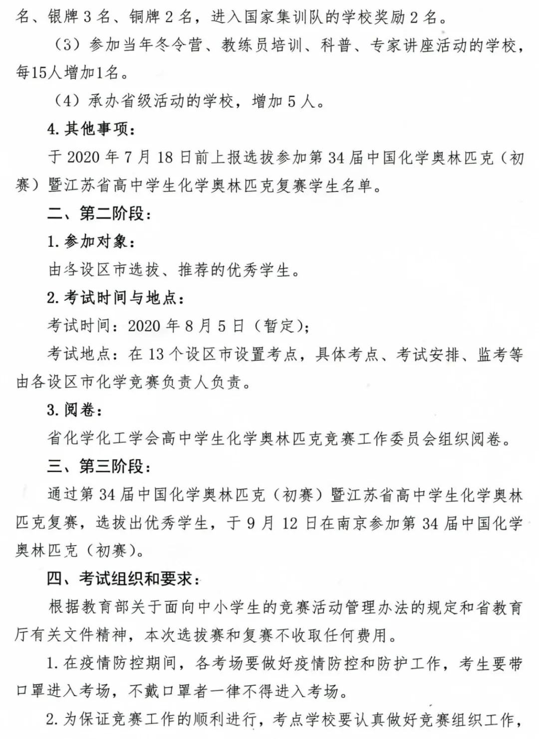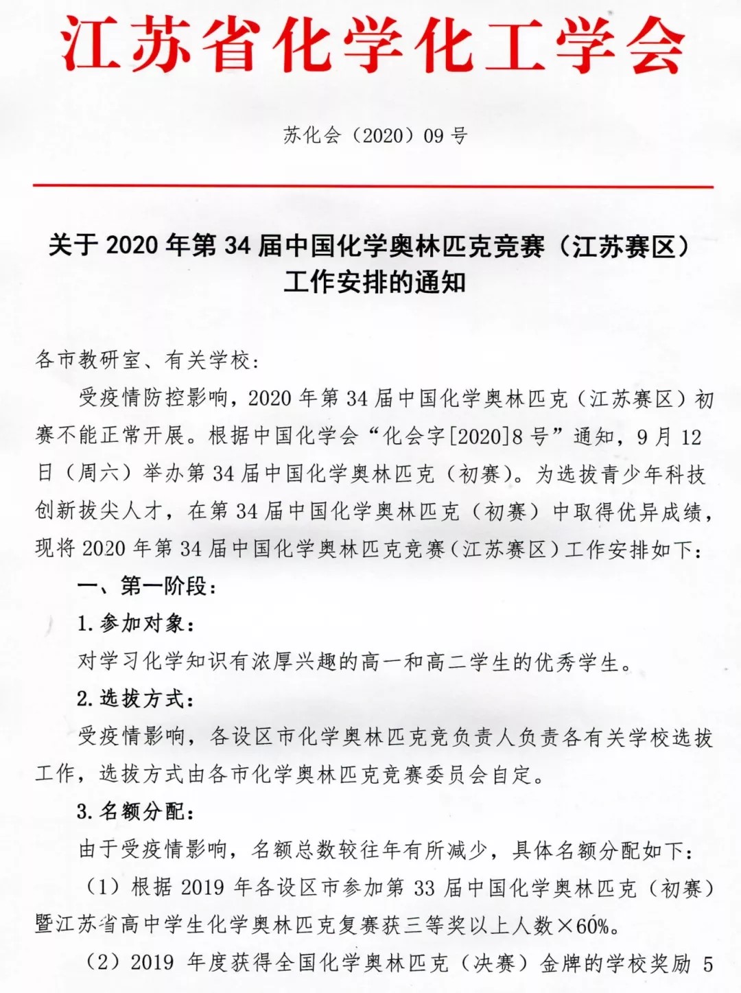 近日,江蘇省化學(xué)化工學(xué)會(huì)發(fā)布了2020年中國(guó)化學(xué)奧林匹克競(jìng)賽江蘇賽區(qū)的安排,明確了2020年化學(xué)初賽時(shí)間為9月12日,舉辦地點(diǎn)為南京。以下是通知原文: