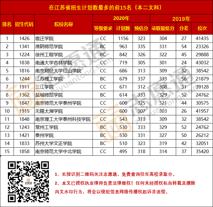 在此,江蘇招生考試網(wǎng)小編為大家整理了“2020年在江蘇省本二批招生計(jì)劃數(shù)最多的15所院校+今年預(yù)估分”,預(yù)估分來源于志愿通多名志愿填報(bào)專家研究得出,僅供大家參考。