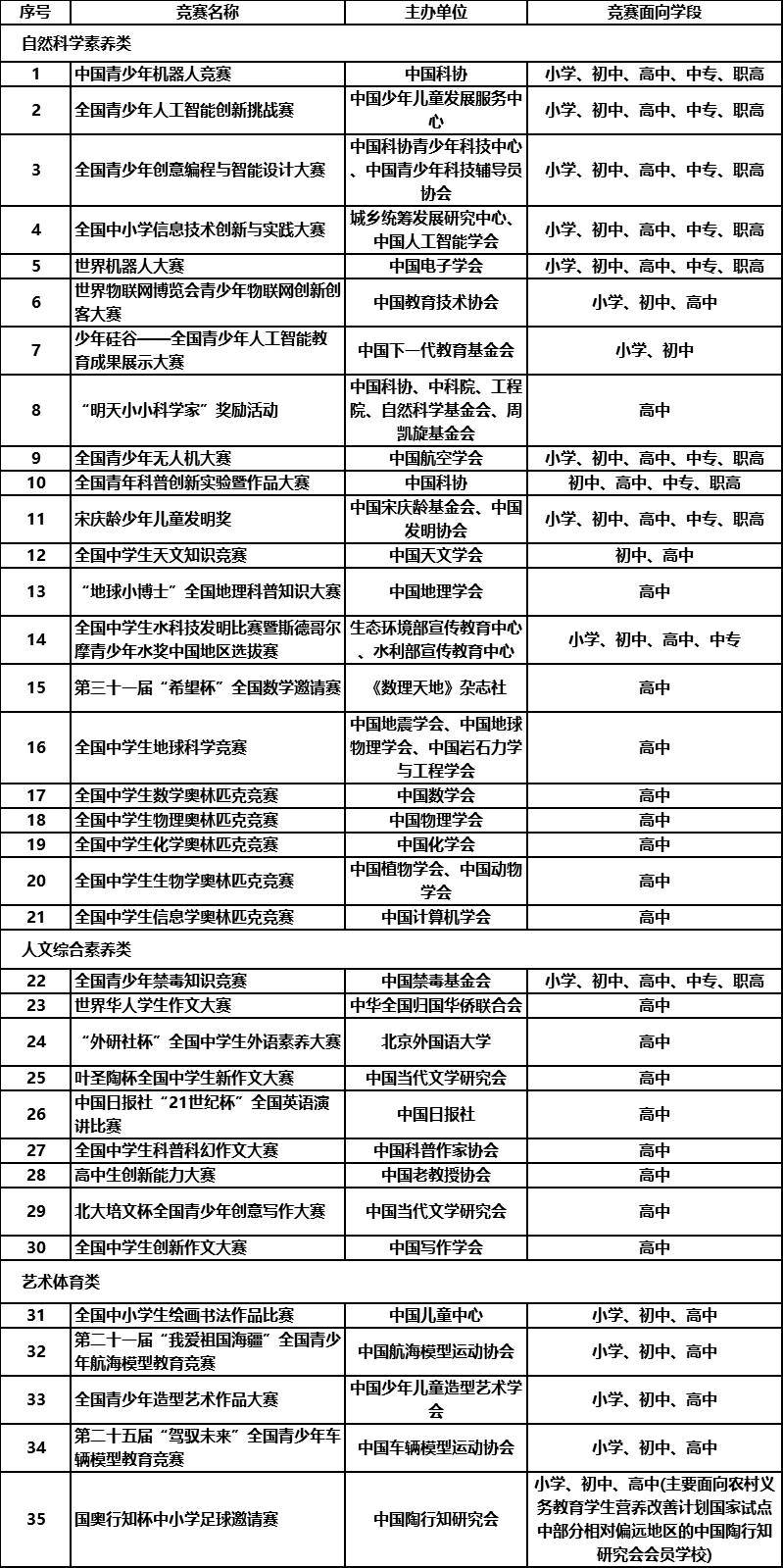 2020-2021學(xué)年面向中小學(xué)生的全國(guó)性競(jìng)賽活動(dòng)名單分為“自然科學(xué)素養(yǎng)類”“人文綜合素養(yǎng)類”“藝術(shù)體育類”三類,共有“中國(guó)青少年機(jī)器人競(jìng)賽”等35項(xiàng)競(jìng)賽進(jìn)入名單。