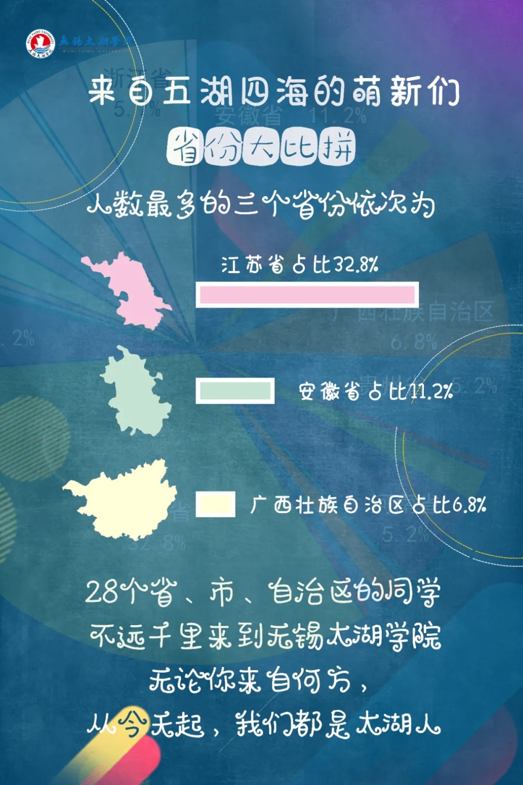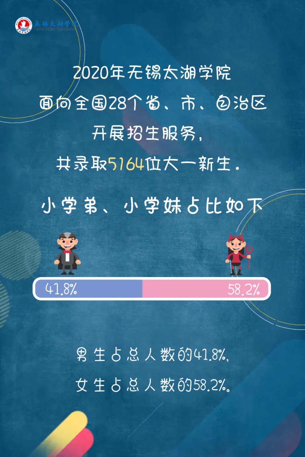 無錫太湖學(xué)院2020級萌新大數(shù)據(jù)來了!2020年無錫太湖學(xué)院面向全國28個省、市、自治區(qū)開展招生,共錄取5164位大一新生。男生占總?cè)藬?shù)的41.8%,女生占總?cè)藬?shù)的58.2%。