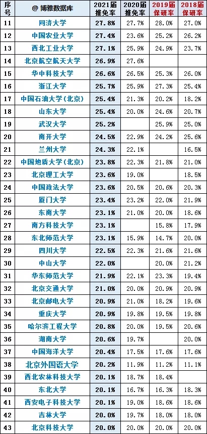 據(jù)博雅數(shù)據(jù)庫(ID:boyashujuku)統(tǒng)計,210所高校2021屆保研率如下: