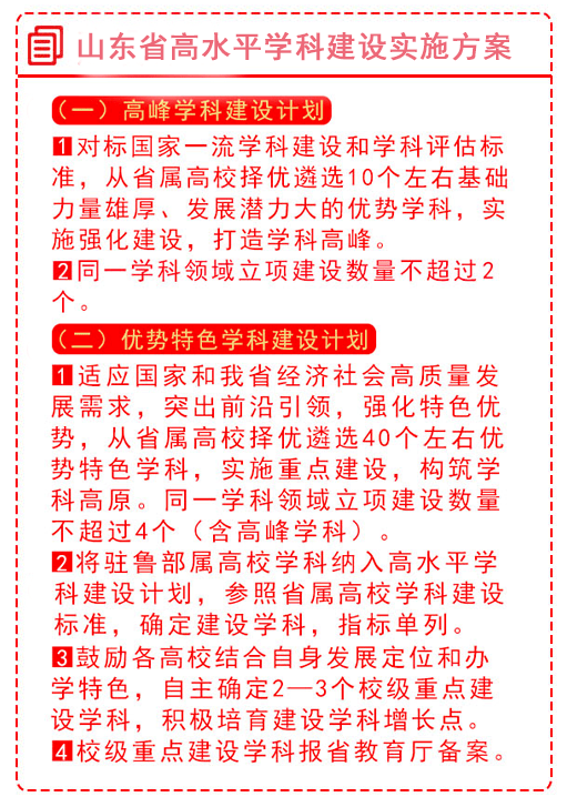 根據(jù)發(fā)布會介紹,7月中旬,山東省教育廳印發(fā)《關(guān)于組織申報山東省高水平大學(xué)和高水平學(xué)科的通知》,啟動高水平大學(xué)和高水平學(xué)科申報遴選工作。截至目前,已組織完成兩輪評審,初步擬定了15所左右高水平大學(xué)、50個左右高水平學(xué)科建議名單,報省委省政府審定后正式啟動建設(shè)工作。