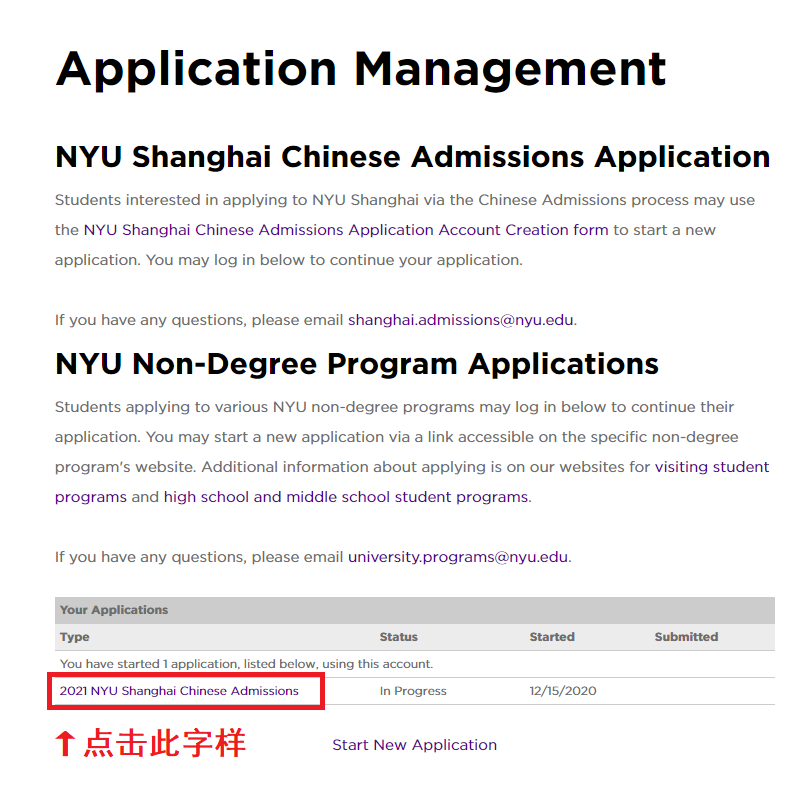 7)用新密碼重新登錄后,在網(wǎng)頁的“Your Applications”表格中,會出現(xiàn)“2021 NYU Shanghai Chinese Applications”的字樣鏈接,即你的上海紐約大學2021本科入學申請狀態(tài),目前狀態(tài)應是“In Progress”。點進該字樣,并按照系統(tǒng)指示,一步步完成Slate系統(tǒng)申請的信息填寫。
