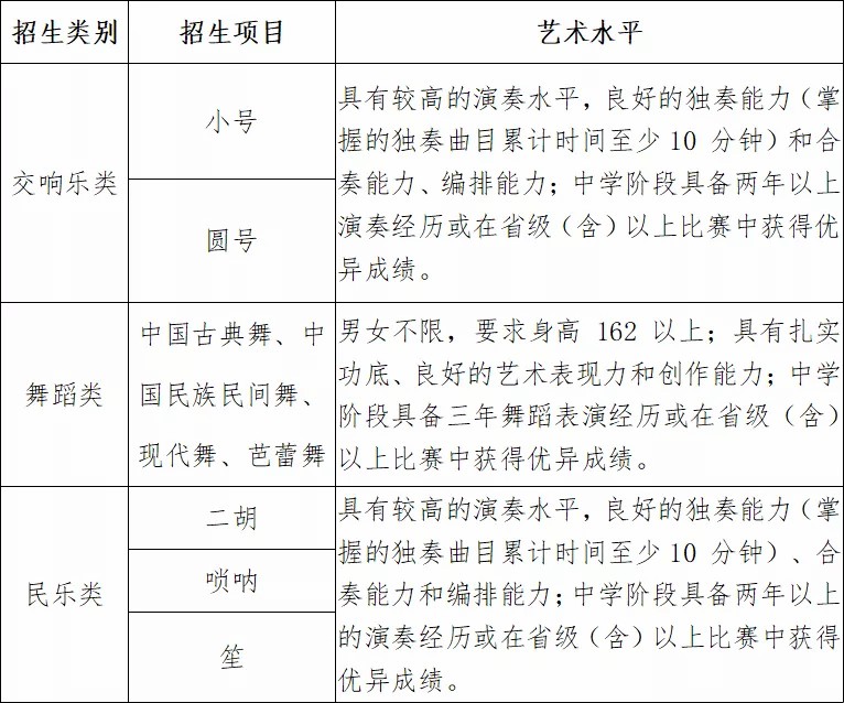 2.有統(tǒng)一水平測試的項目一般應達到國內(nèi)該項目業(yè)余水平最高等級;沒有統(tǒng)一水平測試的項目,應當有參加省級比賽或表演經(jīng)歷。