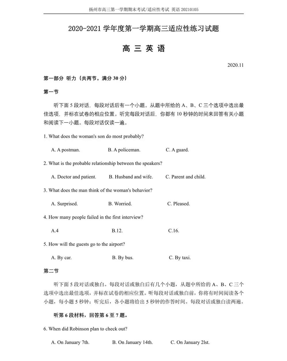 又有試卷可以領(lǐng)啦!今天,江蘇招生考試網(wǎng)小編給大家分享的是1月份揚州市2021屆高三適應性考試練習試卷和答案,快來領(lǐng)取吧!