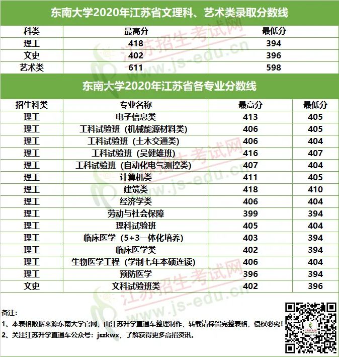 東南大學(xué):東南大學(xué)2020年在江蘇理科中錄取分?jǐn)?shù)最高的專業(yè)是建筑類,418分;最低分的專業(yè)是臨床醫(yī)學(xué)(5+3一體化培養(yǎng))、臨床醫(yī)學(xué)類,均是394分。文科招生專業(yè)只有一個(gè)文科試驗(yàn)班類,最高分402分,最低分396分。