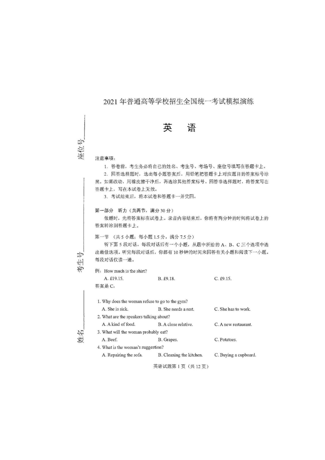 【英語】江蘇省2021年普通高等學(xué)校招生全國統(tǒng)一考試模擬演練英語試題