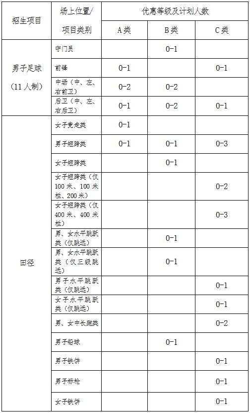 (1)高級中等教育學(xué)校畢業(yè),獲得國家二級運動員(含)以上證書且高中階段在符合我校規(guī)定范圍內(nèi)的全國級比賽中獲得前十二名的主力隊員(報考A類優(yōu)惠等級的考生需在符合我校規(guī)定范圍內(nèi)的全國級比賽中獲得前六名的主力隊員)。