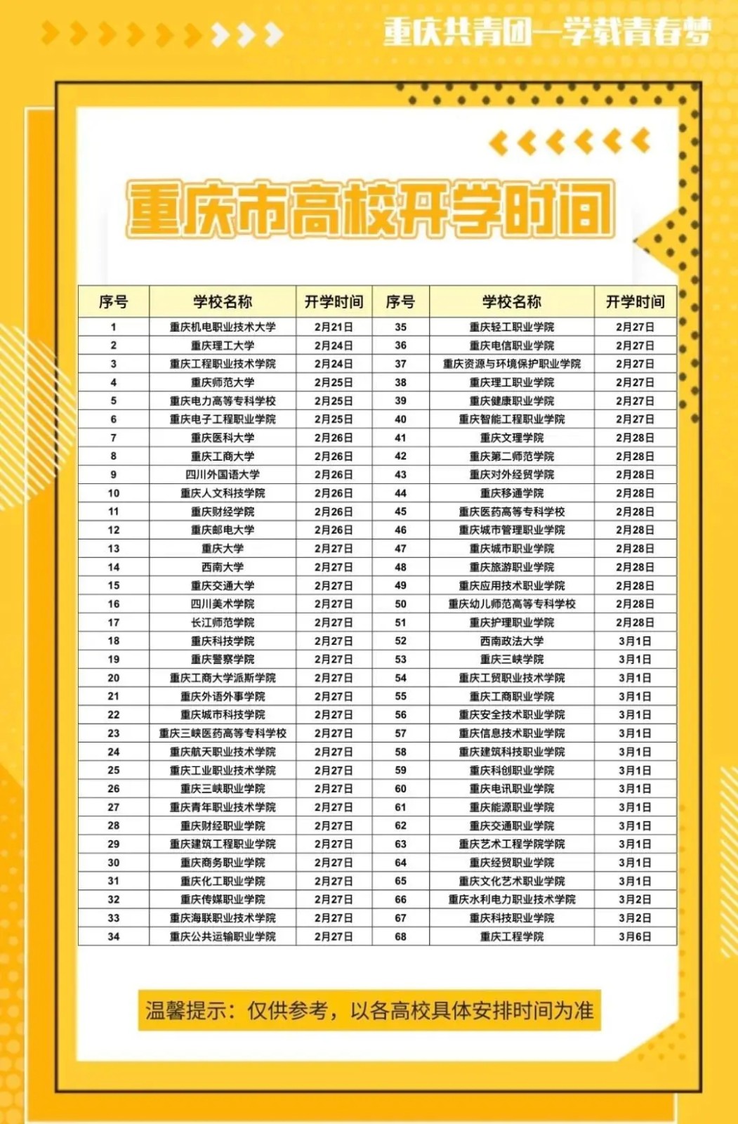 本科生:2020級本科生,返校時間為2月25日;2019級本科生,返校時間為2月26日;2018級本科生,返校時間為2月27日;2017級學(xué)生暫不作返校要求,如因參加公務(wù)員考試、研究生面試等原因,需返校者,于2月28日后返校。正式上課時間為:3月1日(周一,正月十八)。