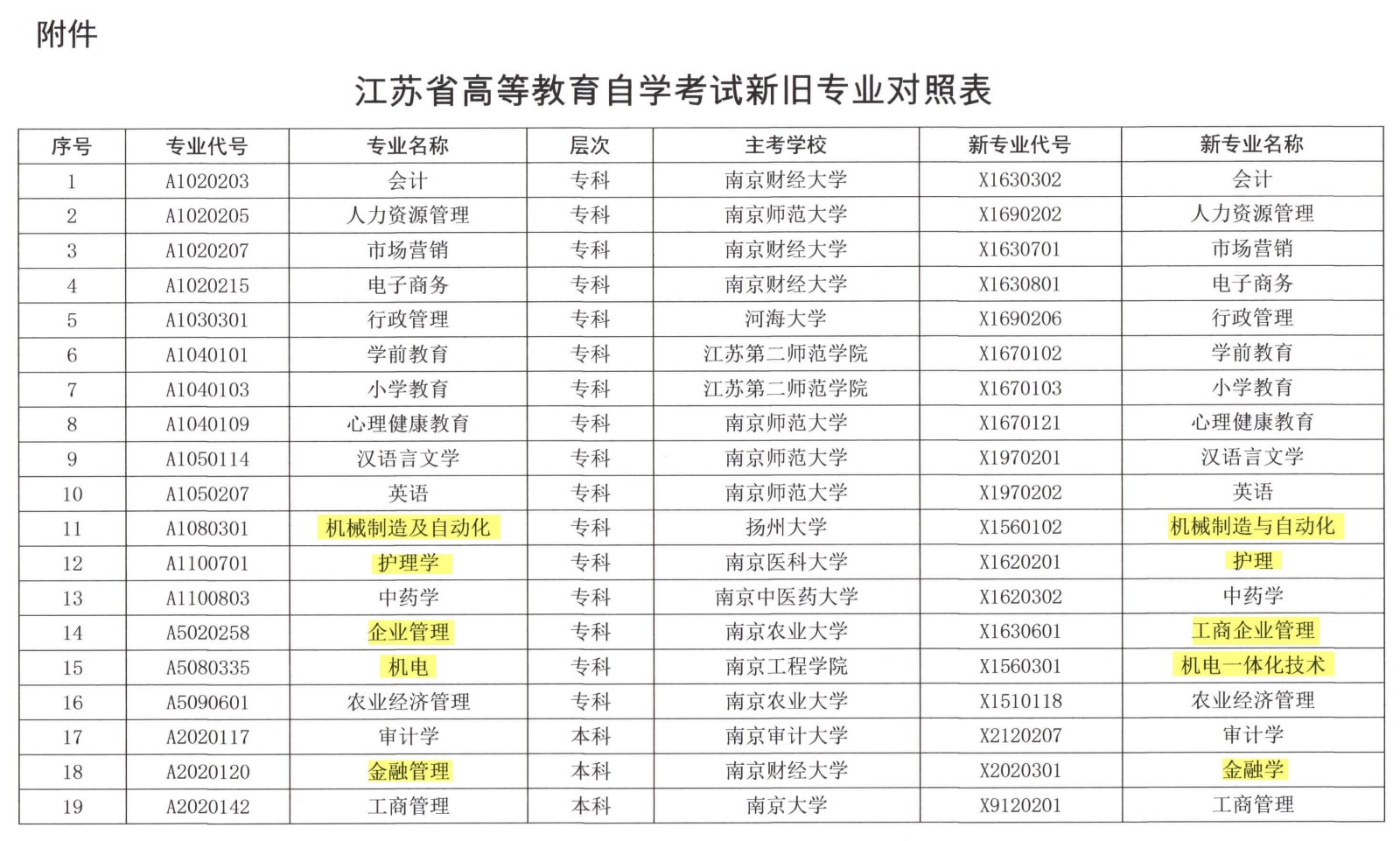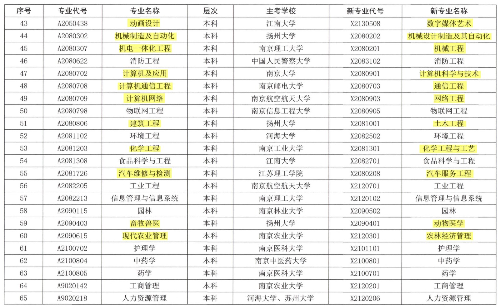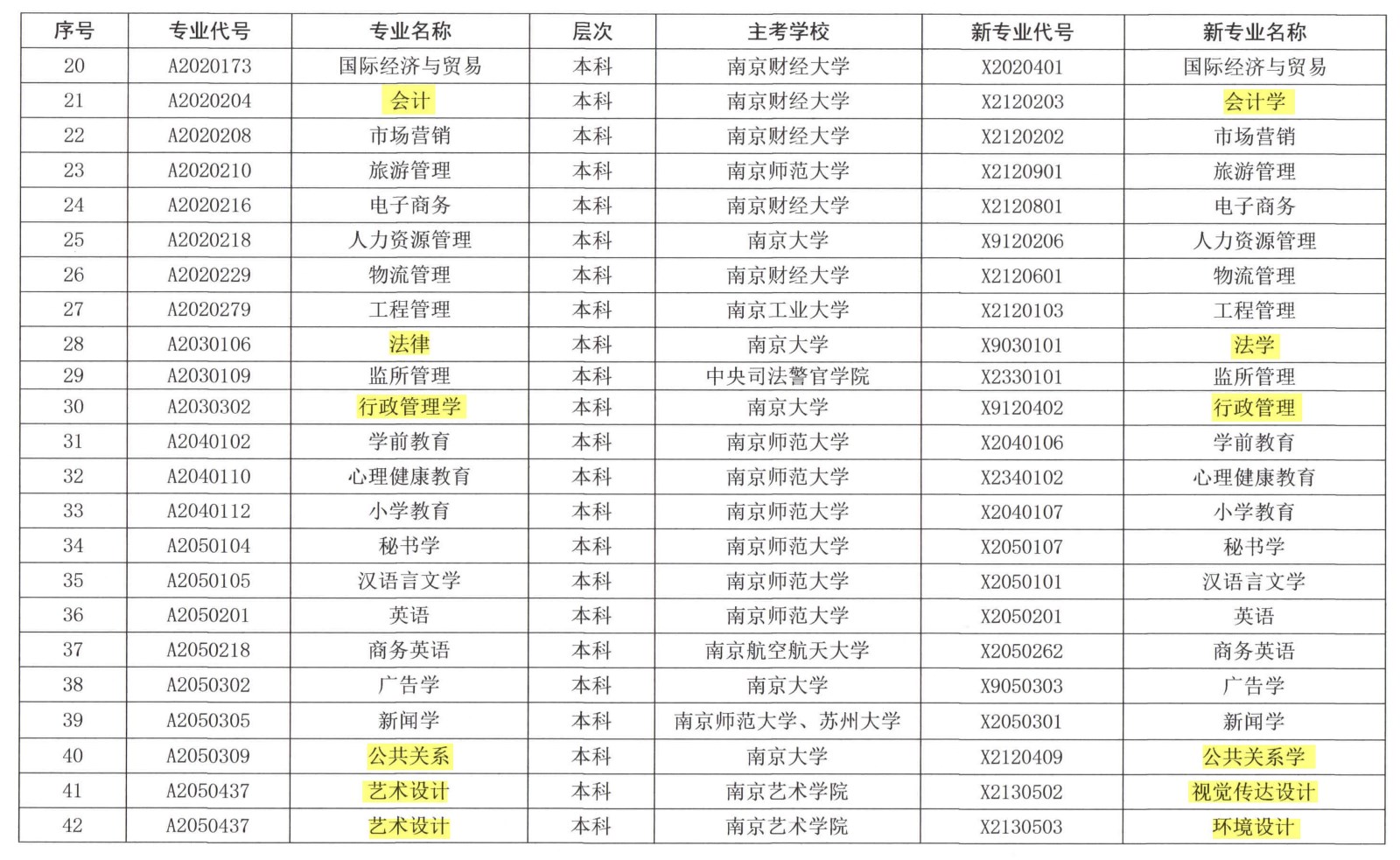 注:圖片為代碼發(fā)生改變的專業(yè),標(biāo)黃部分為改名的專業(yè)