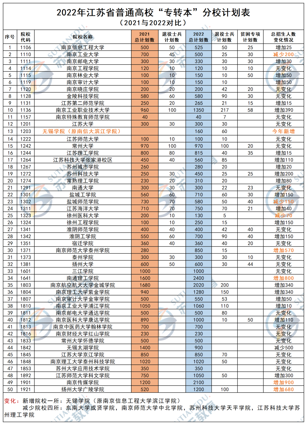 新增一所公辦院校:無(wú)錫學(xué)院(原南京信息工程大學(xué)濱江學(xué)院)。減少四所民辦院校:東南大學(xué)成賢學(xué)院、南京師范大學(xué)中北學(xué)院、蘇州科技大學(xué)天平學(xué)院與江蘇科技大學(xué)蘇州理工學(xué)院。