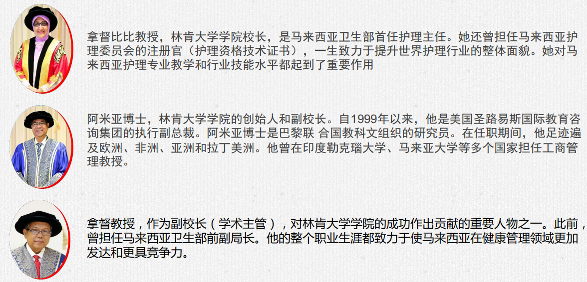 馬來西亞林肯大學的創(chuàng)始人和管理者均為學術院士,分別來自各知名學府及領域的資深教授,并擁有50年高等教學及語言教學經(jīng)驗。馬來西亞林肯大學是一所具有大專、本科、碩士和博士層次教育的馬來西亞全日制高等院校。其中,林肯大學的醫(yī)學、護理、牙科等專業(yè)技術教育排名馬來西亞私立大學前三甲。