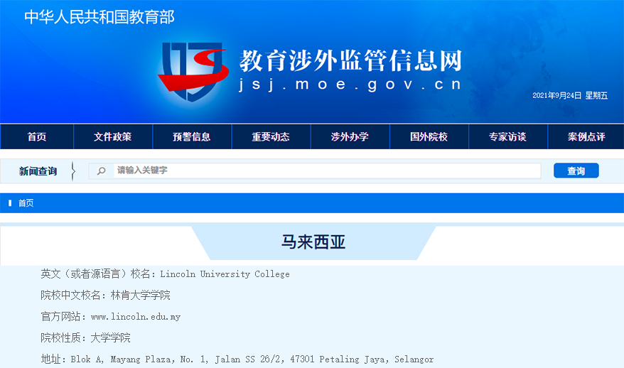 馬來西亞林肯大學在馬來西亞高等教育機構級別評估中被評為“五星院?!保R來西亞能配稱為五星院??偣膊坏?0所,在馬來西亞地位等同于我國985/211大學;馬來西亞林肯大學是中國教育部和中國駐馬來西亞大使館受認證院校,為中馬互認學歷學位協(xié)議院校之一,其學位獲得馬來西亞教育部門及國際高度認可。