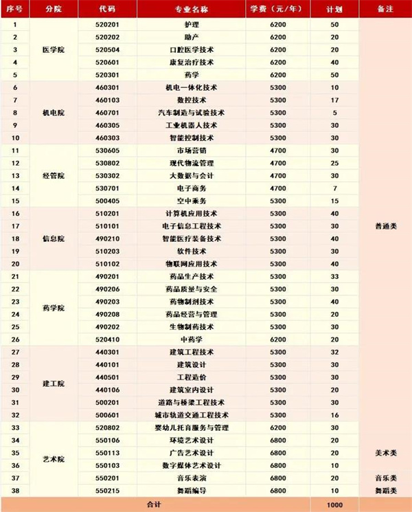 注:以上專業(yè)均為三年制,最終招生專業(yè)及計劃以省教育廳公布為準(zhǔn)。