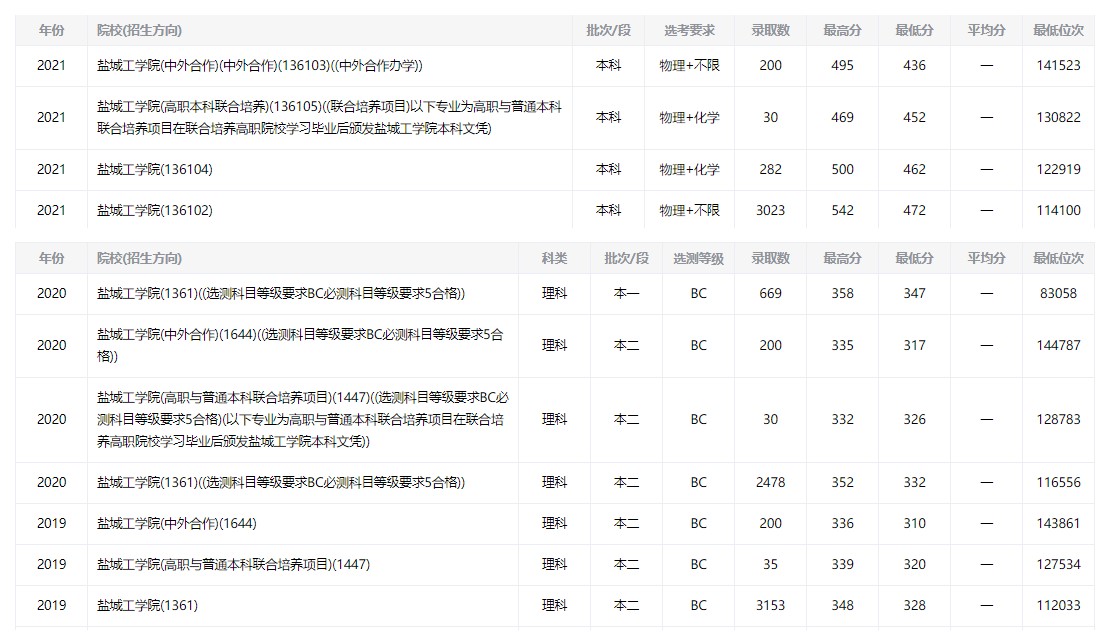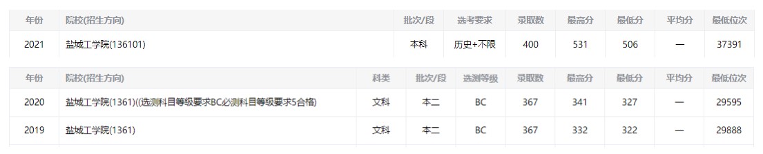 鹽城工學(xué)院近三年分?jǐn)?shù)線及位次