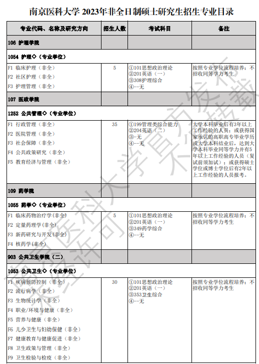 (一)入學(xué)考試分初試和復(fù)試。(二)初試時(shí)間:以教育部公布時(shí)間為準(zhǔn)(詳見(jiàn)準(zhǔn)考證)。(三)初試科目:統(tǒng)考的初試科目為 2 門(公共管理碩士)、3 門(教育學(xué)、歷史學(xué)、醫(yī)學(xué) 3 個(gè)學(xué)科門類的初試科目為 3 門)或 4 門。其中:101-思想政治理論、201-英語(yǔ)一、204-英語(yǔ)二、301-數(shù)學(xué)一、306 -臨床醫(yī)學(xué)綜合能力(西醫(yī))、199- 管理類綜合能力均為全國(guó)統(tǒng)考科目,有關(guān)考試內(nèi)容請(qǐng)參照教育部統(tǒng)一編制的考試大綱;其他科目均由我校自行命題,各科考試時(shí)間均為 3 小時(shí)。綜合課覆蓋科目如下:1. 306 臨床醫(yī)學(xué)綜合能力(西醫(yī))(全國(guó)統(tǒng)一命題)覆蓋科目請(qǐng)參照教育部考試中心編制大綱 ;2. 308 護(hù)理綜合(我校命題)覆蓋護(hù)理學(xué)基礎(chǔ)、內(nèi)科護(hù)理學(xué)及外科護(hù)理學(xué)(詳見(jiàn)教育部公布的大綱);3. 347 心理學(xué)專業(yè)綜合(我校命題)覆蓋普通心理學(xué)、心理研究方法、心理咨詢的理論與實(shí)務(wù)、現(xiàn)代心理與教育統(tǒng)計(jì)學(xué)、心理與教育測(cè)量(參考教育部頒布的應(yīng)用心理專業(yè)碩士考試大綱,重點(diǎn)考察以上內(nèi)容);4. 349 藥學(xué)綜合(我校命題)覆蓋藥物化學(xué)、藥劑學(xué)、藥物分析學(xué)、藥理學(xué)、藥事法規(guī);5. 352 口腔綜合(我校命題)覆蓋口腔內(nèi)科學(xué)、口腔頜面外科學(xué)、口腔正畸學(xué)、口腔修復(fù)學(xué)、口腔解剖生理學(xué)、口腔組織病理學(xué);6. 353 衛(wèi)生綜合(我校命題)覆蓋醫(yī)學(xué)統(tǒng)計(jì)學(xué)、營(yíng)養(yǎng)與食品衛(wèi)生學(xué)、流行病學(xué)、環(huán)境衛(wèi)生學(xué)、職業(yè)衛(wèi)生與職業(yè)醫(yī)學(xué);7. 699 聯(lián)考西醫(yī)綜合(我校命題)覆蓋生理學(xué)、生物化學(xué)、病理學(xué)、診斷學(xué)、外科學(xué)總論(詳見(jiàn)南京醫(yī)科大學(xué)研究生招生網(wǎng) http://yjszs.njmu.edu.cn/);8. 701 生物綜合(我校命題)覆蓋生理學(xué)、生物化學(xué)、細(xì)胞生物學(xué)、微生物學(xué);9. 702 衛(wèi)管綜合(我校命題)覆蓋管理學(xué)原理、衛(wèi)生經(jīng)濟(jì)學(xué)、醫(yī)院管理學(xué)和流行病學(xué);10. 707 心理學(xué)基礎(chǔ)綜合(我校命題)覆蓋普通心理學(xué)、心理研究方法、心理咨詢的理論與實(shí)務(wù)、現(xiàn)代心理與教育統(tǒng)計(jì)學(xué)、心理與教育測(cè)量;11. 708 中醫(yī)綜合(我校命題)覆蓋中醫(yī)基礎(chǔ)理論、中醫(yī)診斷學(xué)、中藥學(xué)、方劑學(xué)、中醫(yī)內(nèi)科學(xué)。(四)初試地點(diǎn):考生在報(bào)考點(diǎn)指定的地點(diǎn)參加初試。南京醫(yī)科大學(xué)官方發(fā)布未經(jīng)許可 不得轉(zhuǎn)載四、體格檢(五)復(fù)試時(shí)間、地點(diǎn)、內(nèi)容及方式由我校自定,復(fù)試辦法將于復(fù)試前在我校研招網(wǎng)公布。復(fù)試時(shí)所帶材料:準(zhǔn)考證(請(qǐng)保留準(zhǔn)考證至 2023 年 9 月)、畢業(yè)證書(shū)、學(xué)位證書(shū)原件(應(yīng)屆本科畢業(yè)生持學(xué)生證,需注冊(cè)完整)、本人身份證。復(fù)試內(nèi)容以大學(xué)本科主干課和基本技能的考核為主。復(fù)試形式包括筆試、實(shí)驗(yàn)或臨床技能操作、面試等。凡初試成績(jī)合格的同等學(xué)力考生,復(fù)試時(shí)須加試兩門大學(xué)本科主干課程。