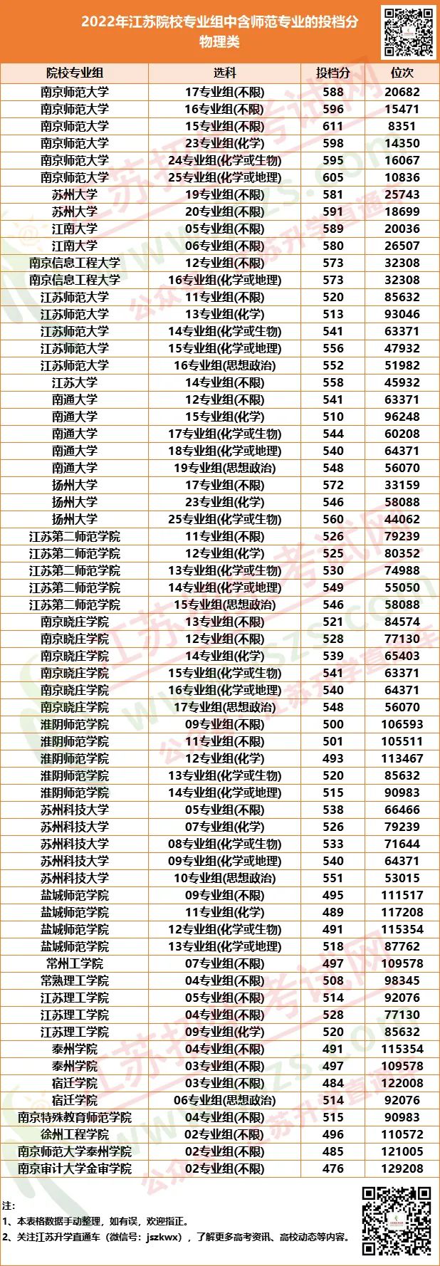目前只有部分高校公布了2022年具體專業(yè)的錄取分數(shù)(如下)。在此,江蘇招生考試網(wǎng)小編整理了2022年江蘇院校專業(yè)組中含師范專業(yè)的投檔分,供大家參考。