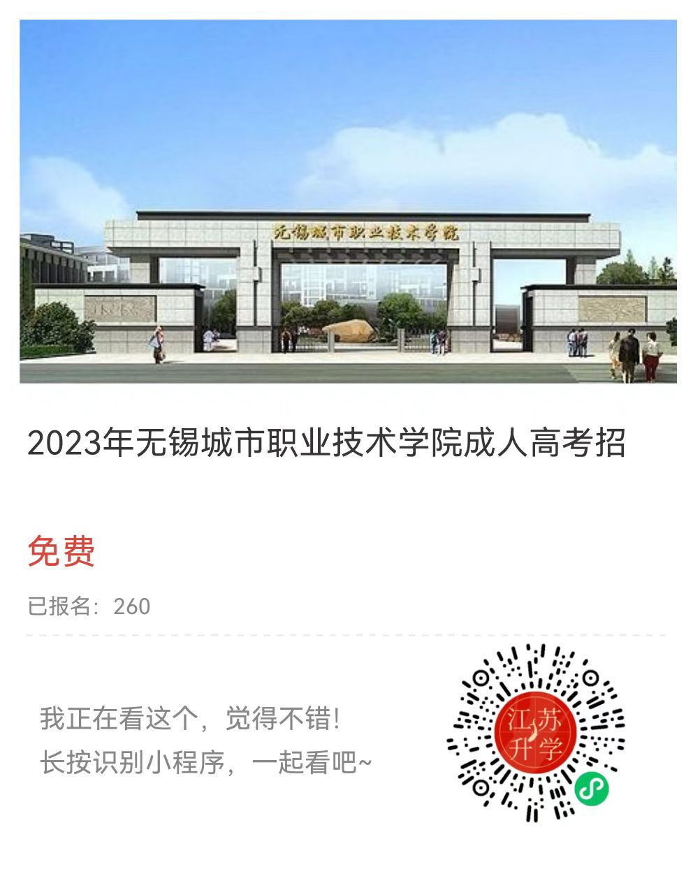 一、學(xué)院概況 無錫城市職業(yè)技術(shù)學(xué)院是經(jīng)江蘇省人民政府批準(zhǔn)設(shè)立并報教育部備案,由無錫市人民政府舉辦的全日制公辦普通高職(??疲W(xué)院。學(xué)院地處無錫藕塘職教園區(qū),校園占地1000余畝,教職工近千人,在校全日制??茖W(xué)生1萬余人。學(xué)院設(shè)有機(jī)電工程學(xué)院、旅游學(xué)院、物聯(lián)網(wǎng)工程學(xué)院、傳媒與藝術(shù)設(shè)計學(xué)院、影視學(xué)院、建筑與環(huán)境工程學(xué)院、師范學(xué)院、貿(mào)易金融學(xué)院、會計學(xué)院及干部培訓(xùn)與繼續(xù)教育學(xué)院等教學(xué)單位,開設(shè)與區(qū)域經(jīng)濟(jì)發(fā)展和產(chǎn)業(yè)結(jié)構(gòu)緊密契合的專業(yè)38個。近幾年,學(xué)院又好又快發(fā)展,形成了全方位辦學(xué)優(yōu)勢。 干部培訓(xùn)與繼續(xù)教育學(xué)院主要從事各種成人學(xué)歷教育工作及各類社會培訓(xùn)工作,地處學(xué)前街,交通便捷,是參加培訓(xùn)與繼續(xù)教育的好地方。2020年無錫城市職業(yè)技術(shù)學(xué)院成人大專招生工作已開始,熱忱歡迎考生報名咨詢。 二、招生對象及條件 普通高中、普通中專、職業(yè)高中、職業(yè)中專、技工學(xué)校應(yīng)屆往屆畢業(yè)生,或具有高中畢業(yè)文化程度的其他社會人員。 三、2022年招生專業(yè) 1、學(xué)歷層次: 高起專 2、學(xué)制: 2.5年;學(xué)習(xí)形式:函授; 3、招生專業(yè): 四、考試科目 高起專入學(xué)需要參加全國成人高考語文、數(shù)學(xué)、英語 (高中文化程度) 五、畢業(yè)與學(xué)位 學(xué)生修完教學(xué)計劃規(guī)定的全部課程,成績合格,發(fā)給《成人高等教育畢業(yè)證書》。符合學(xué)校成人學(xué)士學(xué)位授予條件者,授予學(xué)士學(xué)位。畢業(yè)證書在教育部電子注冊,可在網(wǎng)上查詢 六、報名方式 1、在線報名:登錄江蘇升學(xué)指導(dǎo)中.心成人高考預(yù)報名系統(tǒng),填寫個人姓名、聯(lián)系電話、選擇院校及專業(yè),提交的報名信息后工作人員將會在24小時內(nèi)進(jìn)行回復(fù)確認(rèn)。 七、考試流程 八、報名咨詢 掃碼進(jìn)入小程序免費(fèi)報名→填入個人信息→等候招生老師聯(lián)系(1—3個工作日) 直接聯(lián)系招生老師