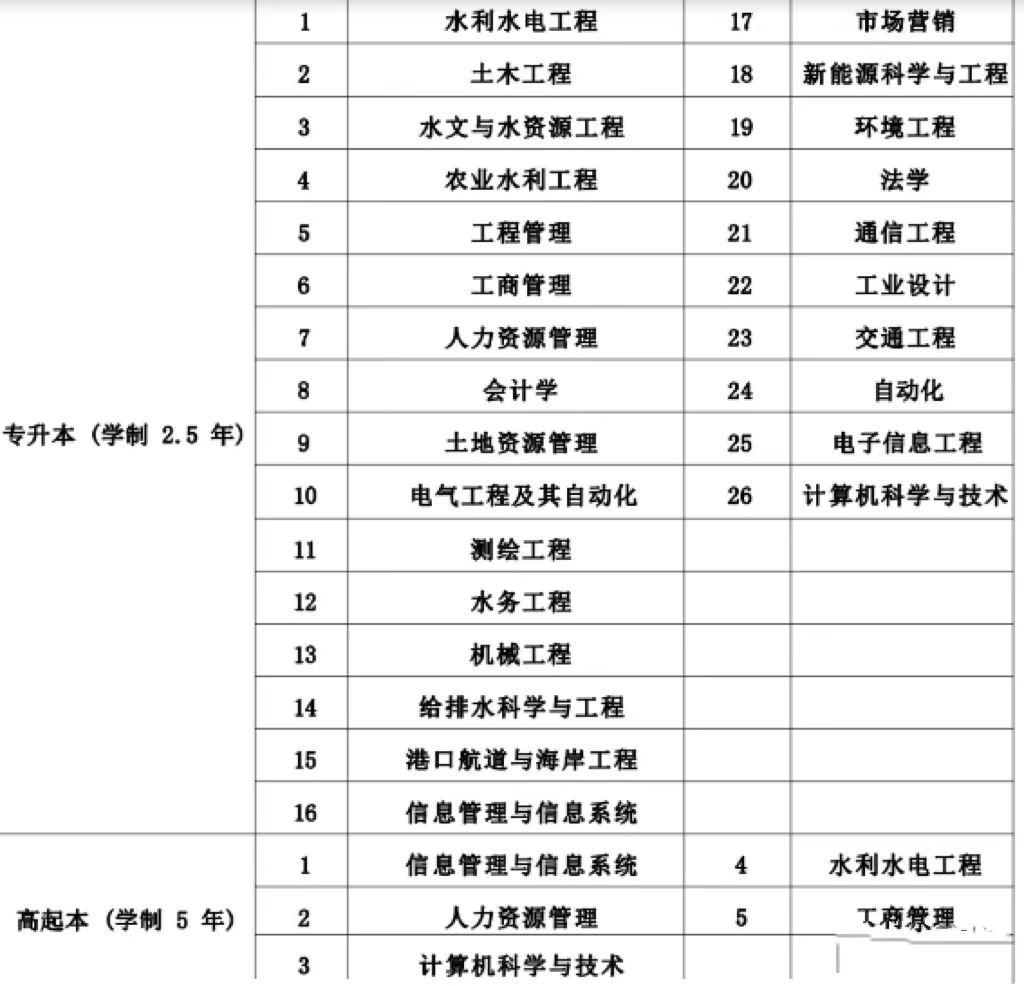 學(xué)校簡介 河海大學(xué)是一所擁有百余年辦學(xué)歷史,以水利為特色,工科為主,多學(xué)科協(xié)調(diào)發(fā)展的教育部直屬全國重點(diǎn)大學(xué),是 實(shí)施國家“211工程”重點(diǎn)建設(shè)、國家優(yōu)勢學(xué)科創(chuàng)新平臺建設(shè)、一流學(xué)科建設(shè)以及教育部批準(zhǔn)設(shè)立研究生院的高校。一百多年來,學(xué)校在治水興邦的奮斗歷程中發(fā)展壯大,被譽(yù)為“水利高層次創(chuàng)新創(chuàng)業(yè)人才培養(yǎng)的搖籃和水利科技創(chuàng)新的重要基地”。 河海大學(xué)繼續(xù)教育具有悠久的歷史,自 1958 年創(chuàng)辦以來,為國家培養(yǎng)了大批實(shí)用性專業(yè)技術(shù)人才,是教育部“高 等學(xué)校繼續(xù)教育示范基地”、人社部“國家專業(yè)技術(shù)人員繼續(xù)教育基地”、水利部行業(yè)定點(diǎn)培訓(xùn)機(jī)構(gòu)。遠(yuǎn)程與繼續(xù)教育 學(xué)院依托學(xué)校雄厚的師資力量和優(yōu)勢學(xué)科,面向全國開展學(xué)歷與非學(xué)歷繼續(xù)教育工作,在江蘇、安徽、浙江、貴州、山 西、遼寧、吉林、湖南、河南、廣東、福建、新疆、云南、四川等省(市)、自治區(qū)設(shè)有函授站或校外學(xué)習(xí)中心,學(xué)歷繼續(xù)教育年招生規(guī)模達(dá) 9000 人左右,非學(xué)歷繼續(xù)教育年規(guī)模達(dá) 14000 人次。 經(jīng)過半個世紀(jì)多的探索和實(shí)踐,河海大學(xué)繼續(xù)教育積累了豐富的辦學(xué)經(jīng)驗,依托水利學(xué)科高等教育的領(lǐng)軍優(yōu)勢,積極創(chuàng)新基于“互聯(lián)網(wǎng)+”的繼續(xù)教育方式,探索并實(shí)施網(wǎng)絡(luò)教學(xué),形成了面向行業(yè)辦學(xué)特色的繼續(xù)教育模式。在學(xué)歷繼續(xù)教育方面,形成了以??破瘘c(diǎn)升本科(簡稱:專升本)為主,兼顧高中起點(diǎn)升本科(簡稱:高起本)和高中起點(diǎn)升專科(簡稱:高起專),水利特色和其它專業(yè)相結(jié)合,多學(xué)科、多層次、多地域的辦學(xué)格局。 目前主要采用函授辦學(xué)形式,開設(shè) 34 個本、??茖I(yè),對符合條件的本科畢業(yè)生授予學(xué)士學(xué)位;在非學(xué)歷繼續(xù)教育方面,圍繞國家戰(zhàn)略、地區(qū)以及行業(yè)發(fā)展需要,積極承擔(dān)相應(yīng)區(qū)域、行業(yè)國家級高層次、急需緊缺和骨干專業(yè)技術(shù)人才的培養(yǎng)培訓(xùn)工作。2021 年與法國 IPAG 高等商學(xué)院共同開展“法國 IPAG 高等商學(xué)院工商管理博士 DBA 和高級工商管理碩士 EMBA”學(xué)位教育項目。非學(xué)歷教育已為國家培養(yǎng)了大批德才兼?zhèn)涞募夹g(shù)人才和管理人才,贏得了良好的社會信譽(yù)。 招生形式 河海大學(xué)高等學(xué)歷繼續(xù)教育屬于國民教育系列,列入國家招生計劃,國家承認(rèn)學(xué)歷。2022年招生包括兩種形式 (一)全國成人高校招生統(tǒng)一考試 參加全國成人高校招生統(tǒng)一考試,由各省、自治區(qū)、直轄市統(tǒng)一組織錄取。 (二)江蘇省成人高校招生改革項目選拔考試 江蘇省成人高校招生改革項目選拔考試包括兩類:艱苦行業(yè)推薦考核擇優(yōu)入學(xué)(簡稱:艱苦行業(yè))和校企合作推薦考核擇優(yōu)入學(xué)(簡稱:校企合作)。由學(xué)校按照單列計劃限額,綜合評價,擇優(yōu)確定擬錄取名單,報江蘇省考試院審批錄取。 招生專業(yè)及計劃 (一)河海大學(xué)2023年高等學(xué)歷繼續(xù)教育全國招生分省分專業(yè)計劃 報考須知 (一)報名條件 1.遵守中華人民共和國憲法和法律; 2.報考高起本、高起??忌鷳?yīng)具有高中畢業(yè)文化程度; 3.報考專升本的考生必須具有經(jīng)教育部審定核準(zhǔn)的國民教育系列大學(xué)??萍耙陨袭厴I(yè)證書的人員; 4.參加江蘇省成人高校招生改革項目選拔考試的考生必須是水利行業(yè)、重點(diǎn)企業(yè)推薦的一線在職工作人員。 (二)報名時間及方式 1.全國成人高校招生統(tǒng)一考試報名時間 網(wǎng)上報名時間:預(yù)計 8 月 25 日至 9 月 18 日之間(具體報名時間以各省招生考試院或招辦公布為準(zhǔn)),考生憑本人有效證件號 碼和本人手機(jī)號碼登錄 2021 年各省考試院(招辦)成人高考網(wǎng)上報名系統(tǒng)報名、信息采集、填報志愿、確認(rèn)本人相關(guān)信息(特殊情 況需現(xiàn)場確認(rèn)) 江蘇籍考生憑本人有效證件自行登錄江蘇省成人高校網(wǎng)上報名系統(tǒng)進(jìn)行網(wǎng)上報名和信息確認(rèn),并支付報名費(fèi)。未經(jīng)信息采集和確認(rèn)者,網(wǎng)上報名無效,報名網(wǎng)址:http://www.jseea.cn。 2.江蘇省成人高校招生改革項目選拔考試報名時間 (1)第一階段預(yù)報名時間:8 月 15 日前。 網(wǎng)址:http://slpx.hhu.edu.cn(進(jìn)入該頁點(diǎn)擊右上角“培訓(xùn)+學(xué)歷”模塊),詳見附件 3。 (2)第二階段報名確認(rèn)時間 推薦單位對申報考生的資格進(jìn)行初審,學(xué)校根據(jù)相關(guān)要求進(jìn)行復(fù)審后由學(xué)校、所在單位進(jìn)行公示。公示無異議的考生根據(jù)學(xué)校 通知在規(guī)定時間內(nèi)憑本人有效證件自行登錄江蘇省成人高校網(wǎng)上報名系統(tǒng)進(jìn)行網(wǎng)上報名和信息確認(rèn),并支付報名費(fèi),未經(jīng)信息采集和確認(rèn)者,網(wǎng)上報名無效。進(jìn)行第二階段的網