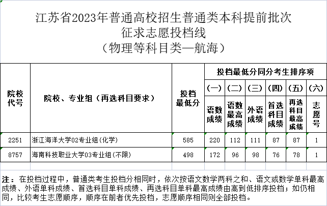 江蘇2023年普通類本科提前批征求志 愿投檔線(物理類-航海)