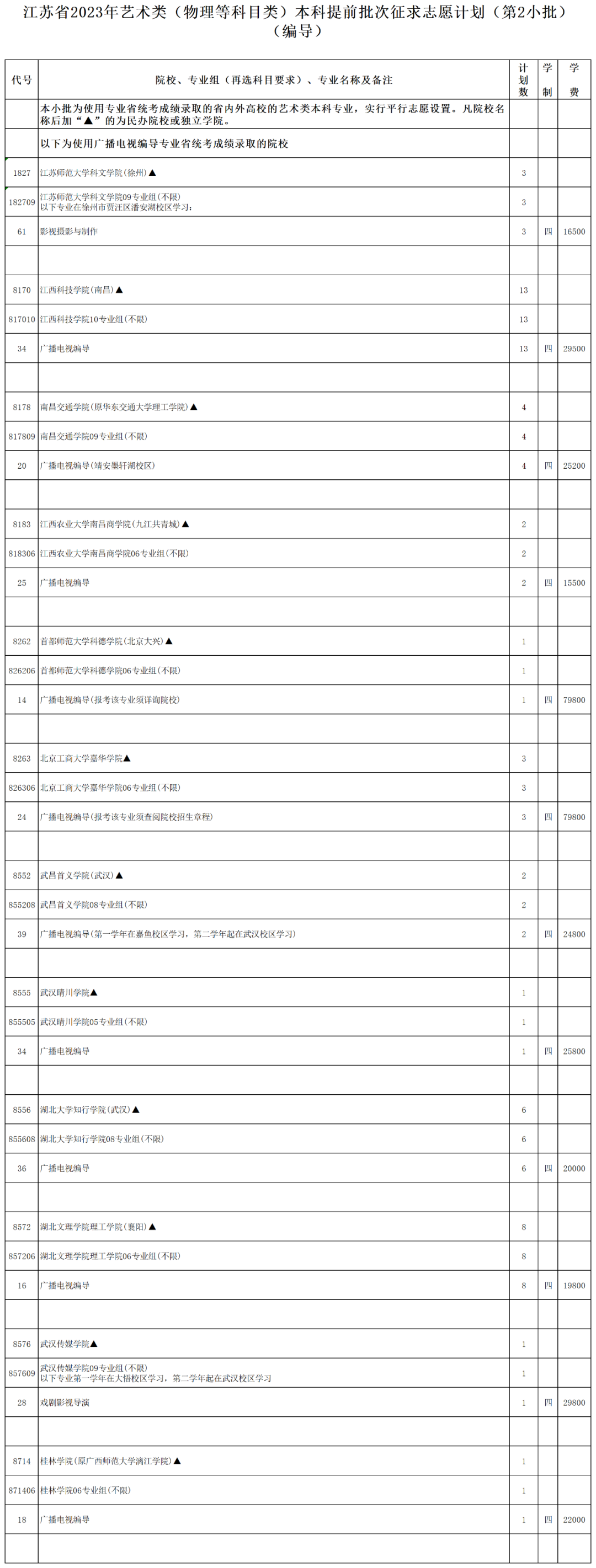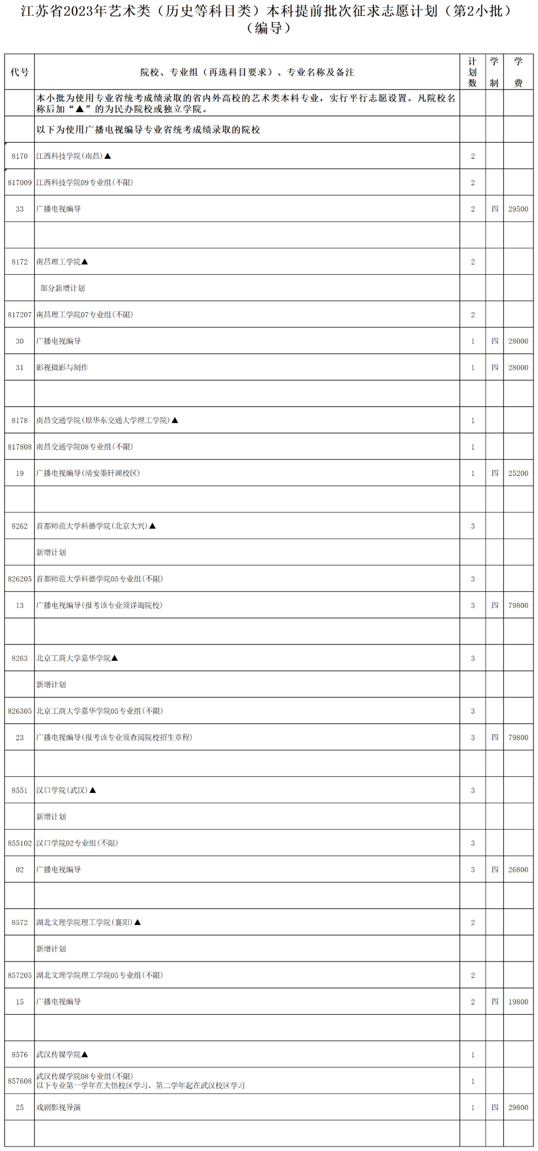 江蘇省2023年藝術(shù)類(歷史等科目類)本科提前批次征求志 愿計劃(第2小批)(編導).xls