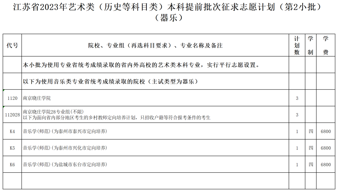 江蘇省2023年藝術(shù)類(歷史等科目類)本科提前批次征求志 愿計劃(第2小批)(器樂).xls