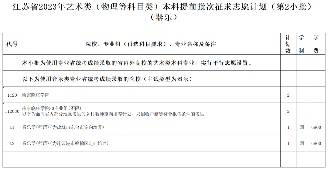 江蘇省2023年藝術(shù)類(物理等科目類)本科提前批次征求志 愿計劃(第2小批)(器樂).xls