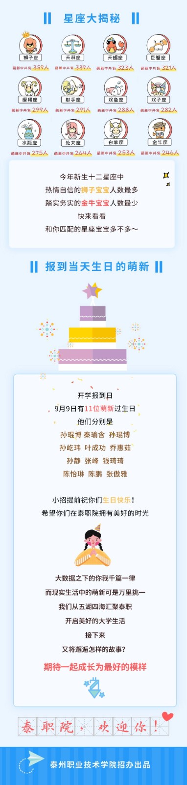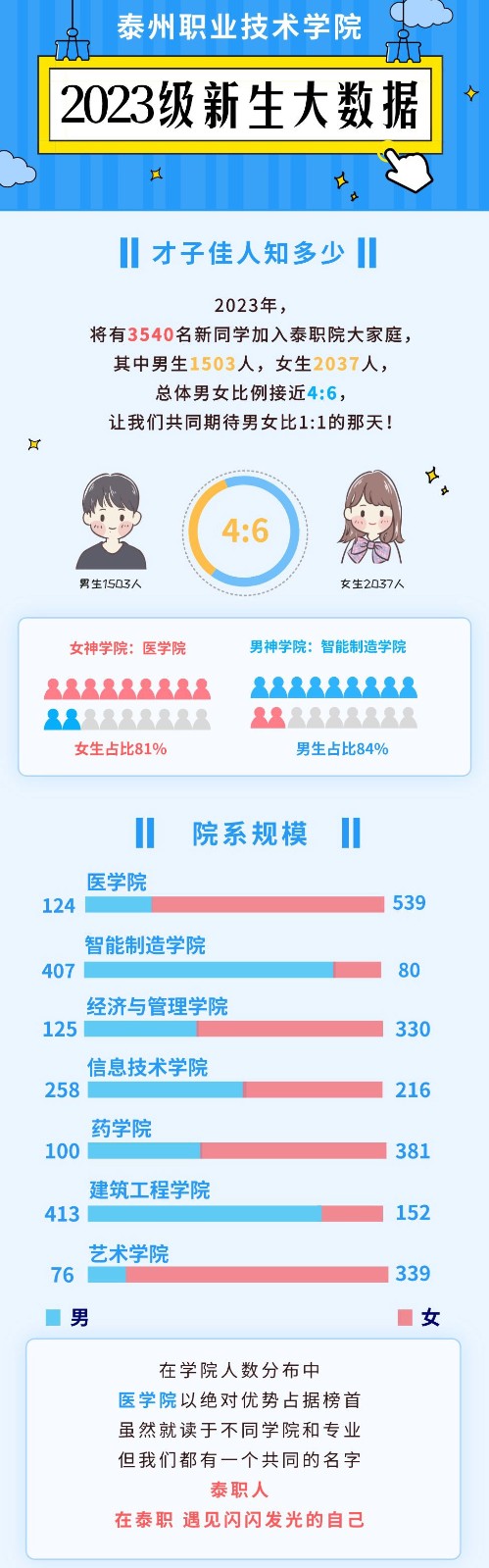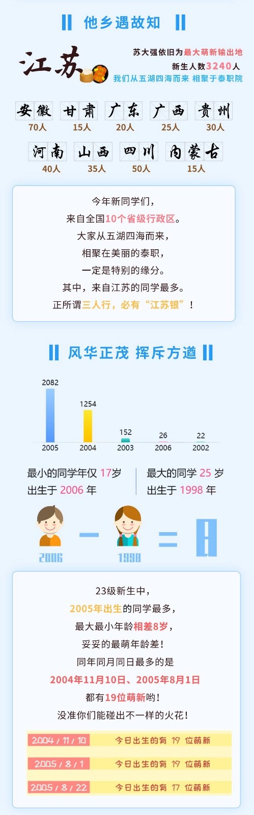 泰州職業(yè)技術(shù)學(xué)院2023級新生大數(shù)據(jù)出爐啦!是否也在關(guān)心新同學(xué)們都來自哪些省份?最大年齡差多少歲?是不是還想知道今年的男女比例?有哪些少數(shù)民族的兄弟姐妹?……別急!跟著江蘇招生考試網(wǎng)小編一起來看看泰州職業(yè)技術(shù)學(xué)院2023級新生大數(shù)據(jù)吧。