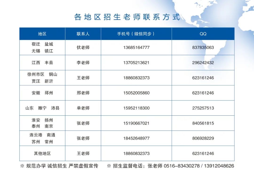 1.招生工作嚴(yán)格執(zhí)行教育部關(guān)于在高校招生中實(shí)施“陽(yáng)光工程”的各項(xiàng)要求,主動(dòng)接受省教育廳、省教育考試院和社會(huì)各界的監(jiān)督,監(jiān)督電話(huà)0516-87370090。